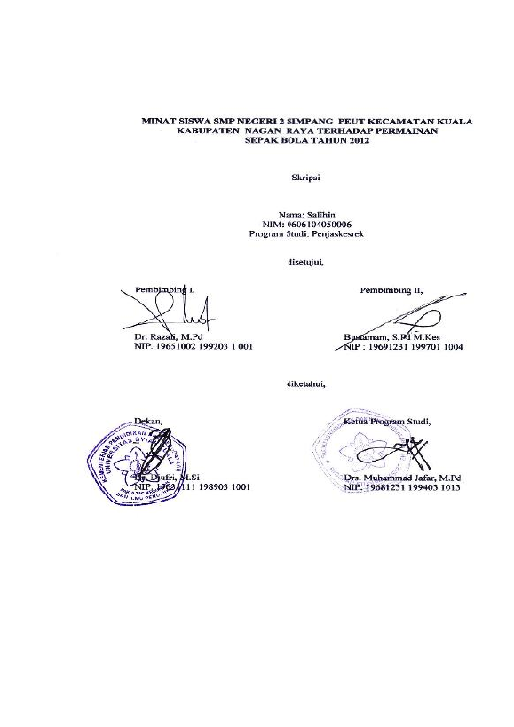 Salihin, MINAT SISWA SMP NEGERI 2 SIMPANG PEUT KECAMATAN KUALARNKABUPATEN NAGAN RAYA TERHADAP PERMAINANRNSEPAK BOLA TAHUN 2012. Banda Aceh Fakultas Keguruan dan Ilmu Pendidikan,2015