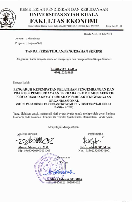 Zuhratul laila, PENGARUH KESEMPATAN PELATHAN PENGEMBANGAN DAN PRAKTEK PEMBERDAYAAN TERHADAP KOMITMEN AFEKTIF SERTA DAMPAKNYA TERHADAP PERIL.AKU KEWARGAAN ORGANISASIONAL (STUDI PADA DOSEN FAKULTAS EKONOMI UNIVERSITAS SYIAH KUALA BANDA ACEH). Banda Aceh Fakultas Ekonomi,2013