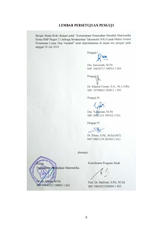 Mutia Riski, KEMAMPUAN PEMECAHAN MASALAH MATEMATIKA SISWA SMP NEGERI 3 LHOKNGA BERDASARKAN TAKSONOMI SOLO PADA MATERI SISTEM PERSAMAAN LINEAR DUA VARIABEL. Banda Aceh Fakultas KIP Pendidikan Matematika,2025