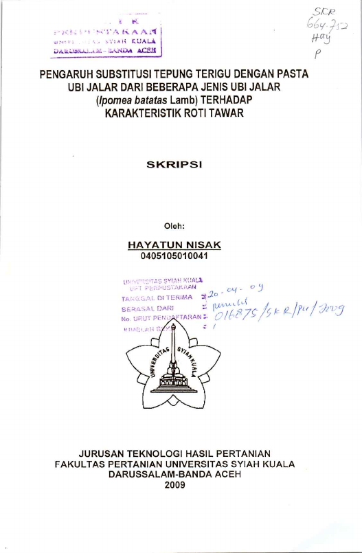 Hayatun Nisak, PENGARUH SUBSTITUSI TEPUNG TERIGU DENGAN PASTA UBI JALAR DARI BEBERAPA JENIS UBI JALAR (IPOMEA BATATAS LAMB) TERHADAP KARAKTERISTIK ROTI TAWAR. Banda Aceh Fakultas Pertanian,2009
