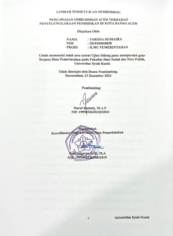 TARISSA HUMAIRA, PENGAWASAN OMBUDSMAN ACEH TERHADAP PENYELENGGARAAN PENDIDIKAN DI KOTA BANDA ACEH. Banda Aceh Fakultas FISIPOL,2025