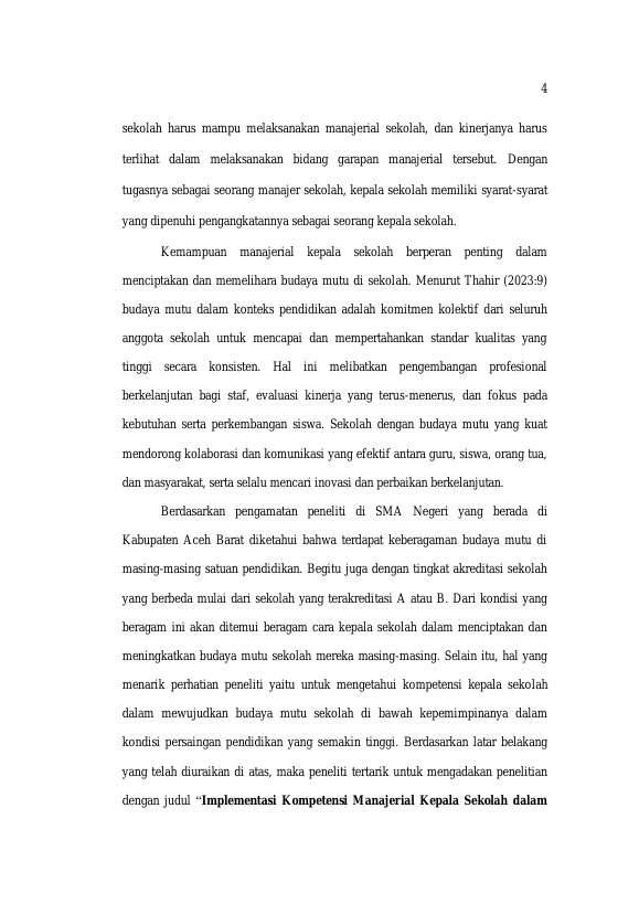 Ferryzal Umar, IMPLEMENTASI KOMPETENSI MANAJERIAL KEPALA SEKOLAH DALAM MENINGKATKAN BUDAYA MUTU SEKOLAH MENENGAH ATAS NEGERI RNDI ACEH BARAT. Banda Aceh Program Studi Magister Administrasi Pendidikan,2025