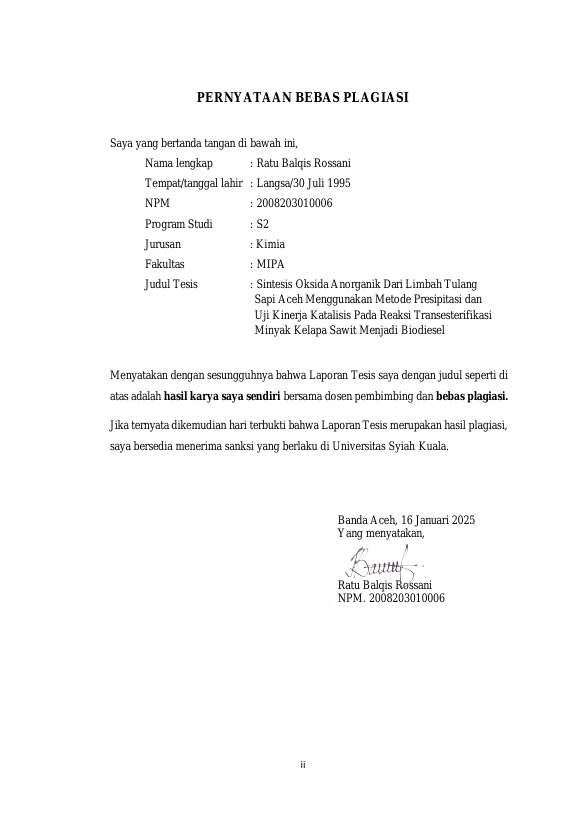 Baca Juga : SINTESIS OKSIDA ANORGANIK DARI LIMBAH TULANG SAPI ACEH MENGGUNAKAN METODE PRESIPITASI DAN UJI KINERJA KATALISIS PADA REAKSI TRANSESTERIFIKASI MINYAK KELAPA SAWIT MENJADI BIODIESEL (Ratu Balqis Rossani, 2025)