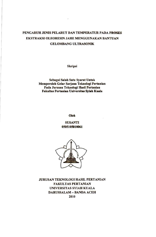 Susanti, PENGARUH JENIS PELARUT DAN TEMPERATUR PADA PROSES EKSTRAKSI OLEORESIN JAHE MENGGUNAKAN BANTUAN GELOMBANG ULTRASONIK. Banda Aceh Fakultas Pertanian,2010