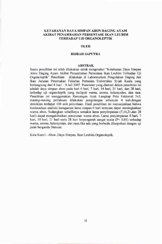 Baca Juga : KETAHANAN DAYA SIMPAN ABON DAGING AYAM AKIBAT PENAMBAHAN PERSENTASE IKAN LEUBIM(CANTHIDERMIS MACULATA) TERHADAP UJI ORGANOLEPTIK (Hijrah Saputra, 2025)