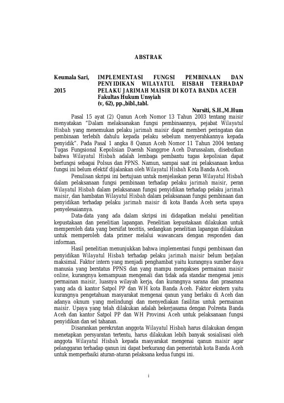 Keumala Sari, IMPLEMENTASI FUNGSI PEMBINAAN DAN PENYIDIKAN WILAYATUL HISBAH TERHADAP PELAKU JARIMAH MAISIR DI KOTA BANDA ACEH. Banda Aceh Universitas Syiah Kuala,2015