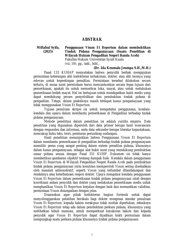 MIFTAHUL SYIFA, PENGGUNAAN VISUM ET REPERTUM DALAM MEMBUKTIKAN TINDAK PIDANA PENGANIAYAAN (SUATU PENELITIAN DI WILAYAH HUKUM PENGADILAN NEGERI BANDA ACEH. Banda Aceh Fakultas Hukum,2025