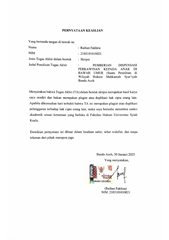 Baca Juga : PELAKSANAAN PENGAJUAN PERMOHONAN DISPENSASI KAWIN (SUATU PENELITIAN PADA MAHKAMAH SYAR’IYAH BANDA ACEH) (Laiyina Miska, 2024)