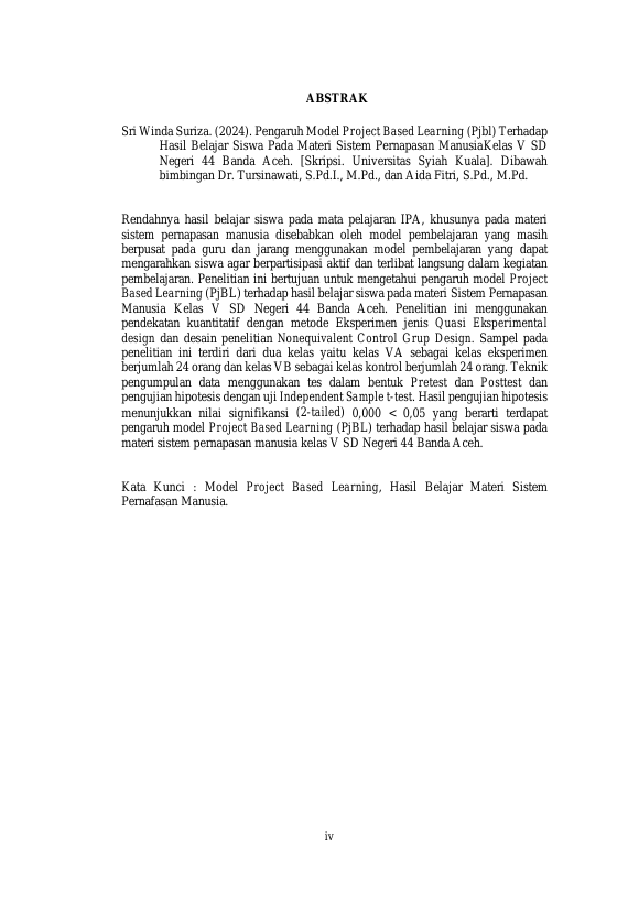 Sri winda suriza, PENGARUH MODEL PROJECT BASED LEARNING (PJBL) TERHADAP HASIL BELAJAR SISWA PADA MATERI SISTEM PERNAPASAN MANUSIA KELAS V SD NEGERI 44 BANDA ACEH. Banda Aceh Fakultas KIP PGSD (S1),2025