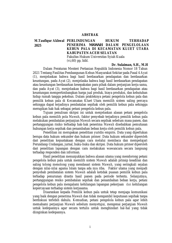 M. TAUFIQUR AKHWAL, PERLINDUNGAN HUKUM TERHADAP PENERIMA MAWAH DALAM PENGELOLAAN KEBUN PALA DI KECAMATAN KLUET UTARA KABUPATEN ACEH SELATAN. Banda Aceh Fakultas Hukum,2025