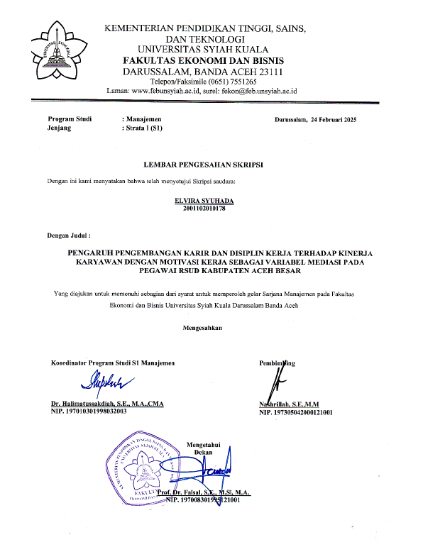 Elvira syuhada, PENGARUH PENGEMBANGAN KARIR DAN DISIPLIN KERJA TERHADAP KINERJA KARYAWAN DENGAN MOTIVASI KERJA SEBAGAI VARIABEL MEDIASI PADA PEGAWAI RSUD KABUPATEN ACEH BESAR. Banda Aceh Fakultas Ekonomi Manajemen,2025