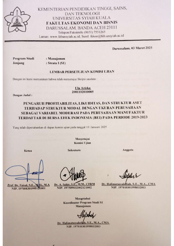 Ula Ariska, PENGARUH PROFITABILITAS, LIKUIDITAS DAN STRUKTUR ASET TERHADAP STRUKTUR MODAL DENGAN UKURAN PERUSAHAAN SEBAGAI VARIABEL MODERASI PADA PERUSAHAAN MANUFAKTUR TERDAFTAR DI BURSA EFEK INDONESIA (BEI) PADA PERIODE 2019-2023. Banda Aceh Fakultas Ekonomi dan Bisnis Manajemen,2025