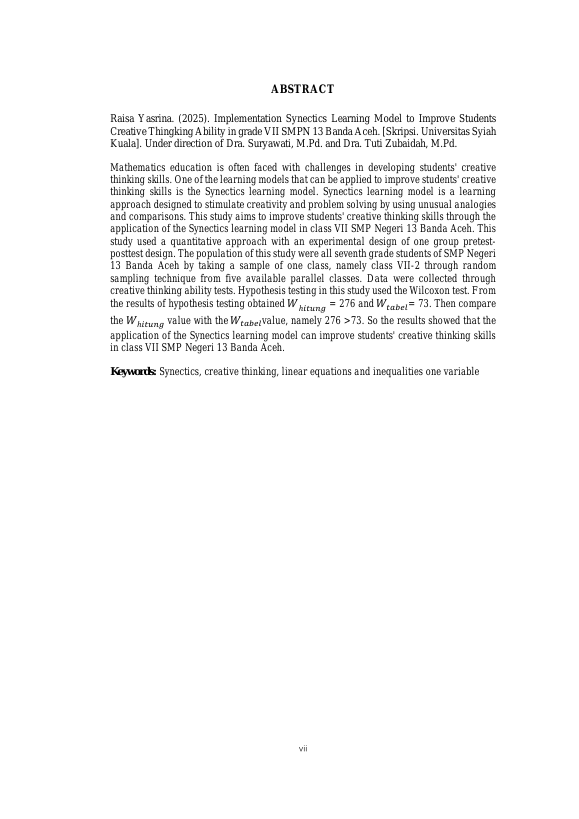 RAISA YASRINA, PENERAPAN MODEL PEMBELAJARAN SYNECTICS UNTUK MENINGKATKAN KEMAMPUAN BERPIKIR KREATIF SISWA DI KELAS VII SMP NEGERI 13 BANDA ACEH. Banda Aceh Fakultas KIP Matematika,2025