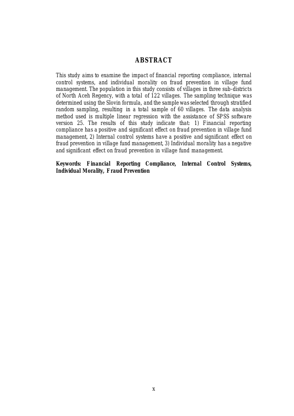 Tia Shinta Dewi, PENGARUH KEPATUHAN PELAPORAN KEUANGAN , SISTEM PENGENDALIAN INTERNAL DAN MORALITAS INDIVIDU TERHADAP PENCEGAHAN FRAUD DALAM PENGELOLAAN DANA DESA (STUDI EMPIRIS PADA DESA DI TIGA KECAMATAN KABUPATEN ACEH UTARA). Banda Aceh Fakultas Ekonomi dan Bisnis Akuntansi (S1),2025