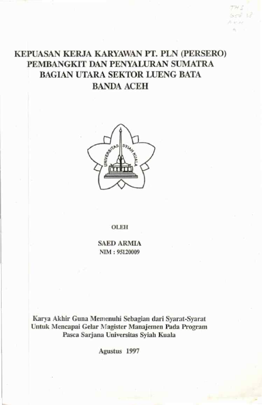 saed Armia, KEPUASAN KERJA KARYAWAN PT. PLN (PERSERO) PEMBANGKIT DAN PENYALURAN SUMATRA BAGIAN UTARA SEKTOR LUENG BATA BANDA ACEH. Banda Aceh Prog. Studi Magister Manajemen,1997