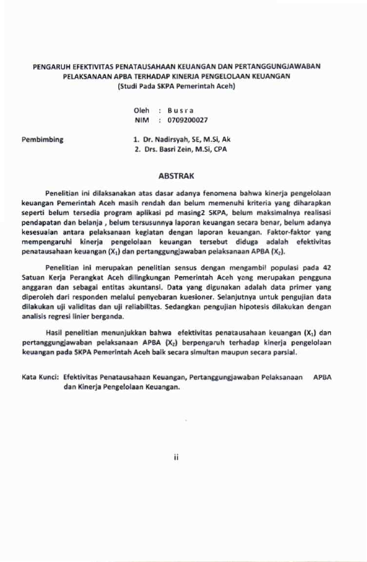 Busra, PENGARUH EFEKTIVITAS PENATAUSAHAAN KEUANGAN DAN PERTANGGUNG.JAWABAN PELAKSANAAN APBA TERHADAP KINERJA PENGELOLAAN KEUANGAN PADA SKPA PEMERINTAH ACEH. Banda Aceh Program Studi Magister Akuntansi Universitas Syiah Kuala,2010