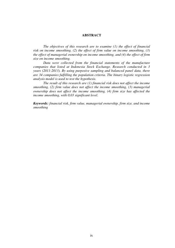 Tira Fitrah, PENGARUH RISIKO KEUANGAN, NILAI PERUSAHAAN,RNKEPEMILIKAN MANAJERIAL, DAN UKURANRNPERUSAHAAN TERHADAP PERATAAN LABA PADARNPERUSAHAAN MANUFAKTUR YANG TERDAFTAR DIRNBURSA EFEK INDONESIA. Banda Aceh Universitas Syiah Kuala,2015