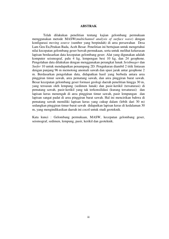 Fazrul Ichsan, KAJIAN GELOMBANG PERMUKAAN MENGGUNAKAN METODE SEISMIK MASW (MULTICHANNEL ANALYSIS OF SURFACE WAVE) DI DESA LAM GEU EU, PEUKAN BADA, ACEH BESAR. Banda Aceh Universitas Syiah Kuala,2015