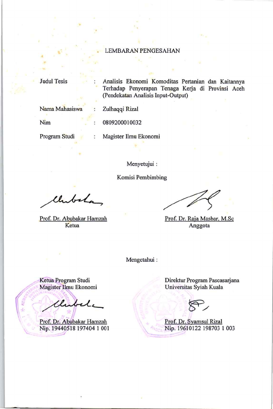 Zulhaqqi Rizal, ANALISIS EKONOMI KOMODITAS PERTANIAN DAN KAITANNYA TERHADAP PENYERAPAN TENAGA KERJA DI PROVINSI ACEH (PENDEKATAN ANALISIS INPUT-OUTPUT). Banda Aceh Prog. Studi Megister Ilmu Ekonomi,