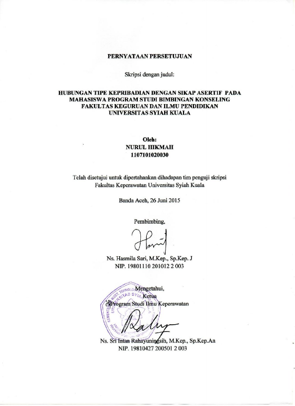NURUL HIKMAH, HUBUNGAN TIPE KEPRIBADIAN DENGAN SIKAP ASERTIF PADA MAHASISWA PROGRAM STUDI BIMBINGAN RNKONSELING FAKULTAS KEGURUAN DAN ILMU RNPENDIDIKAN UNIVERSITAS SYIAH KUALA. Banda Aceh Universitas Syiah Kuala,2015