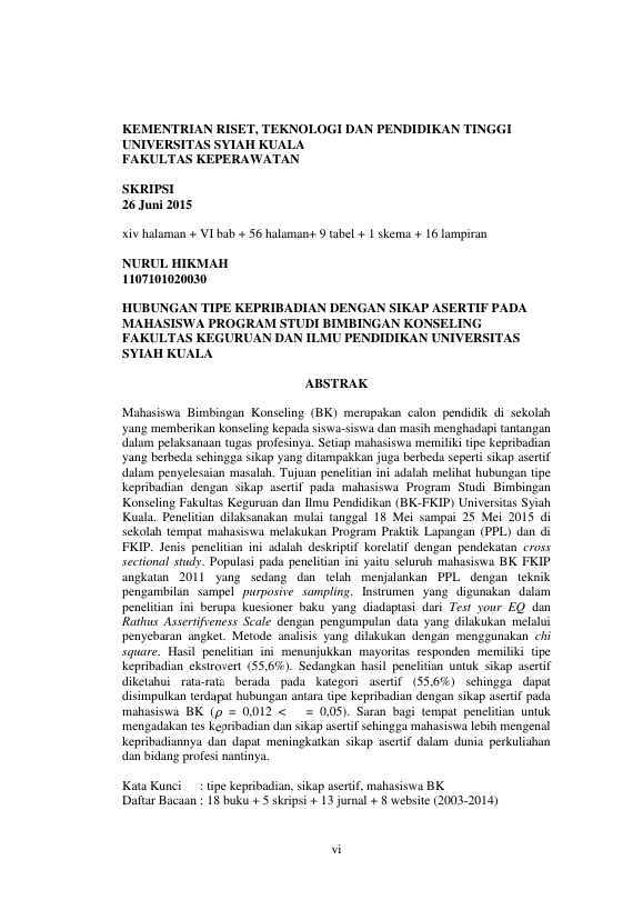 NURUL HIKMAH, HUBUNGAN TIPE KEPRIBADIAN DENGAN SIKAP ASERTIF PADA MAHASISWA PROGRAM STUDI BIMBINGAN RNKONSELING FAKULTAS KEGURUAN DAN ILMU RNPENDIDIKAN UNIVERSITAS SYIAH KUALA. Banda Aceh Universitas Syiah Kuala,2015