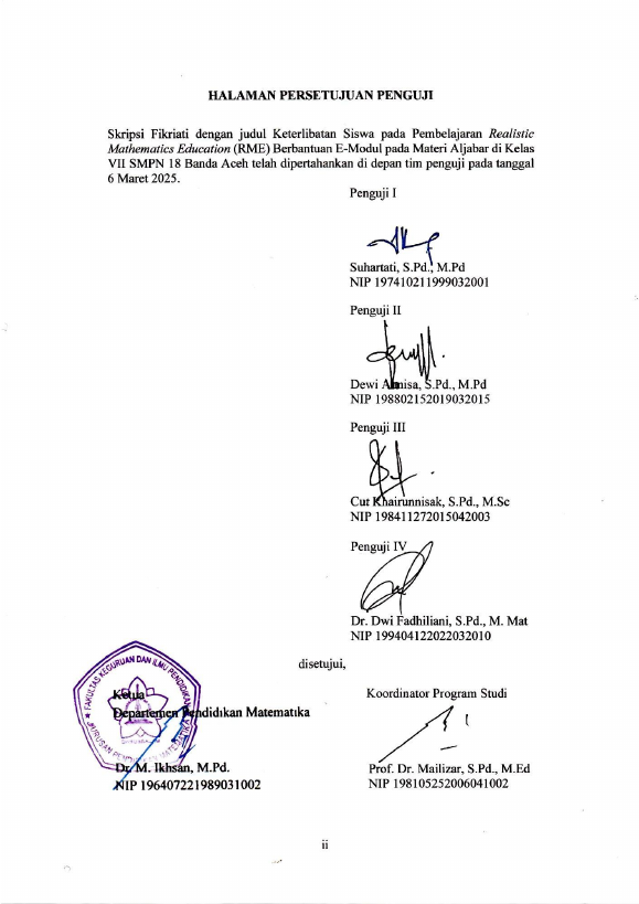Fikriati, KETERLIBATAN SISWA PADA PEMBELAJARAN REALISTIC MATHEMATICS EDUCATION (RME) BERBANTUAN E-MODUL PADA MATERI ALJABAR DI KELAS VII SMPN 18 BANDA ACEH. Banda Aceh Fakultas KIP Matematika,2025