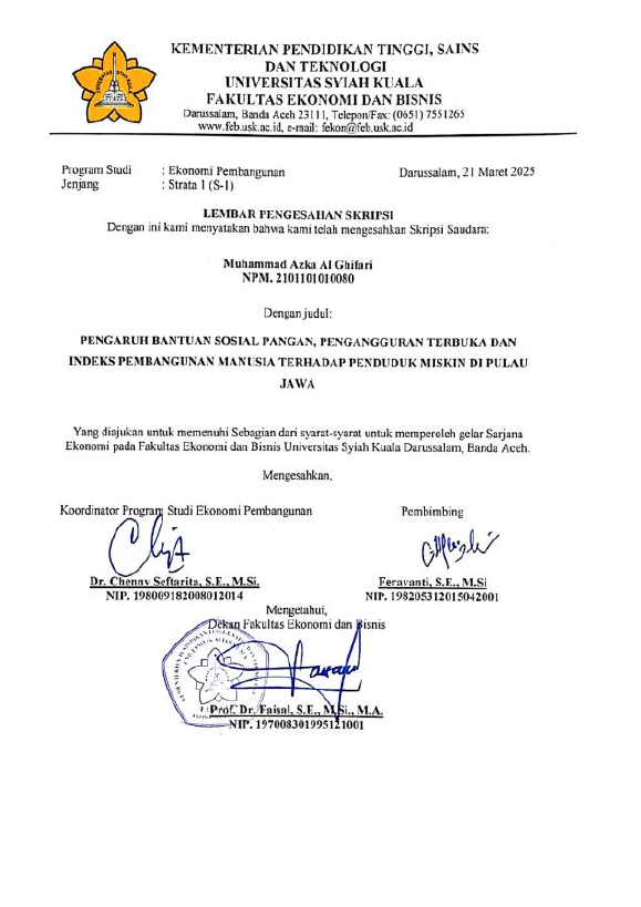 MUHAMMAD AZKA AL GHIFARI, PENGARUH BANTUAN SOSIAL PANGAN, PENGANGGURAN TERBUKA DAN INDEKS PEMBANGUNAN MANUSIA TERHADAP PENDUDUK MISKIN DI PULAU JAWA. Banda Aceh Fakultas Ekonomi Pembangunan,2025