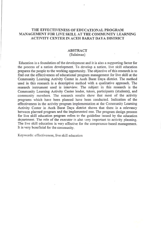 Sulaiman, EFEKTIVITAS PENGELOLAAN PROGRAM PENDIDIKAN KECAKAPAN HIDUP PADA PKBM KABUPATEN ACEH BARAT DAYA. Banda Aceh prog. studi magister pendidikan,2008