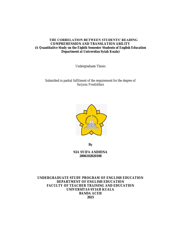 NIA SYIFA ANDHINA, THE CORRELATION BETWEEN STUDENTS’ READING COMPREHENSION AND TRANSLATION ABILITY (A QUANTITATIVE STUDY ON THE EIGHTH SEMESTER STUDENTS OF ENGLISH EDUCATION DEPARTMENT AT UNIVERSITAS SYIAH KUALA). Banda Aceh Fakultas KIP Pendidikan Bahasa Inggris,2025
