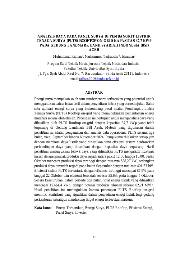 Muhammad Raihan, ANALISIS DAYA PADA PEMBANGKIT LISTRIK TENAGA SURYA (PLTS) ROOFTOP ON-GRID KAPASITAS 37,7 KWP PADA GEDUNG LANDMARK BANK SYARIAH INDONESIA (BSI) ACEH.. Banda Aceh Teknik Mesin dan Industri,2025