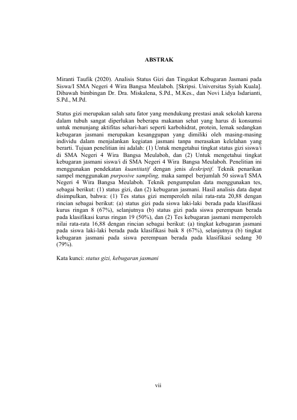 Miranti Taufik, ANALISIS STATUS GIZI DAN TINGKAT KEBUGARAN JASMANI PADA SISWA/I SMA NEGERI 4 WIRA BANGSA MEULABOH. Banda Aceh Fakultas KIP Pendidikan Jasmani, Kesehatan dan Rekreasi,2025
