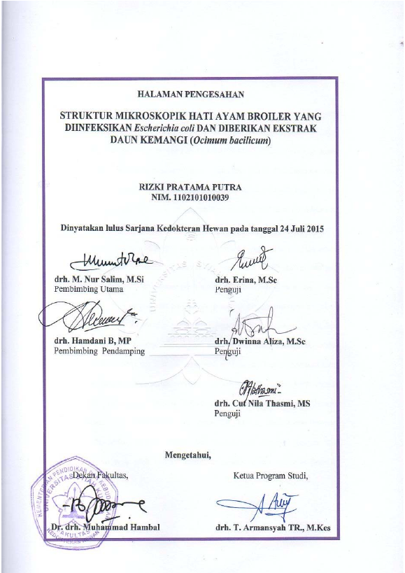 Baca Juga : GAMBARAN PATOLOGI ANATOMI HATI DAN JANTUNG BROILER YANG DIINFEKSIKAN ESCHERICHIA COLI DAN DIBERI EKSTRAK DAUN KEMANGI (OCIMUM BASILICUM) (Jetri Adila, 2015)