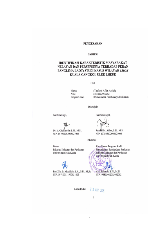 TAUFIQUL AFFAN ASSIDIQ, IDENTIFIKASI KARAKTERISTIK MASYARAKAT NELAYAN DAN PERSEPSINYA TERHADAP PERAN PANGLIMA LAOT; STUDI KASUS WILAYAH LHOK KUALA CANGKOI, ULEE LHEUE. Banda Aceh Fakultas Kelautan dan Perikanan Pemanfaatan Sumberdaya Perikanan,2025