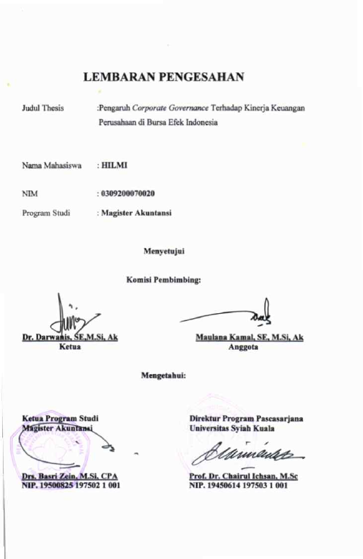 Hilmi, PENGARUH CORPORATE GOVERNANCE TERHADAP KINERJA KEUANGAN PERUSAHAAN DI BURSA EFEK INDONESIA. Banda Aceh Program Studi Magister Sains Akuntansi,2009