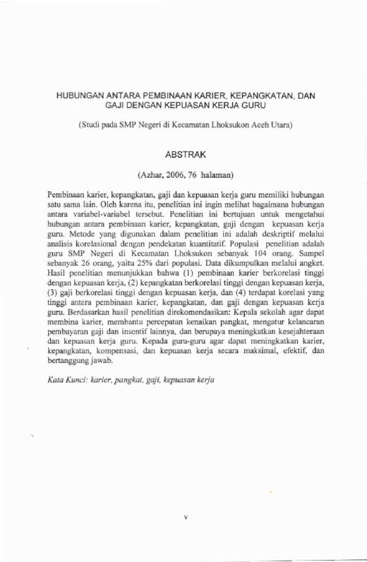 Azhar, HUBUNGAN ANTARA PEMBINAAN KARIER, KEPANGKATAN, DAN GAJI DENGAN KEPUASAN KERJA GURU (STUDI PADA SMP NEGERI DI KECAMATAN LHOKSUKON ACEH UTARA). Banda Aceh prog.studi magister manajemen pendidikan,
