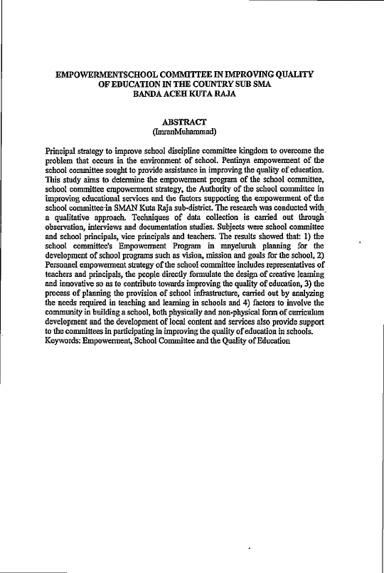 Imran Muhammad, PEMBERDAYAAN KOMITE SEKOLA DALAM MENINGKATKAN MUTU PENDIDIKAN DI SMA NEGERI KECAMATAN KUTA RAJA BANDA ACEH. Banda Aceh prog. studi magister pendidikan,2012