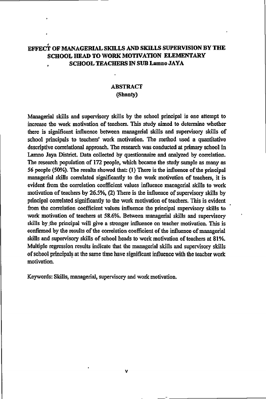 Shanty, PENGARUH KETERAMPILAN MANAJERIAL DAN KETERAMPILAN SUPERVISI OLEH KEPALA SEKOLAH TERHADAP MOTIVASI KERJA GURU SEKOLAH DASAR DI LAMNO KECAMATAN JAYA. Banda Aceh prog. studi magister pendidikan,2010