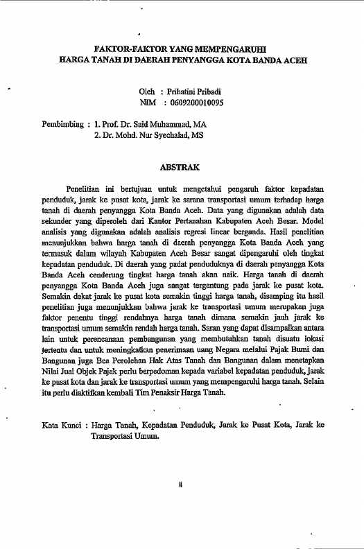 Prihatini Pribadi, FAKTOR-FAKTOR YANG MEMPENGARUHI HARGA TANAH DI DAERAH PENYANGGA KOTA BANDA ACEH. Banda Aceh Prog. Studi Magister Ilmu Ekonomi,2011