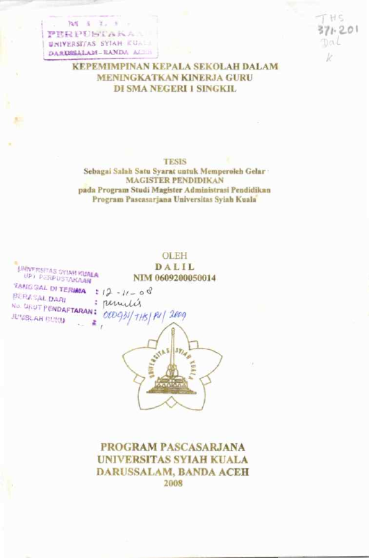 Dalil, KEPEMIMPINAN KEPALA SEKOLAH DALAM MENINGKATKAN KINERJA GURU DI SMA NEGER I SINGKIL. Banda Aceh prog. studi magister administrasi pendidikan,2008
