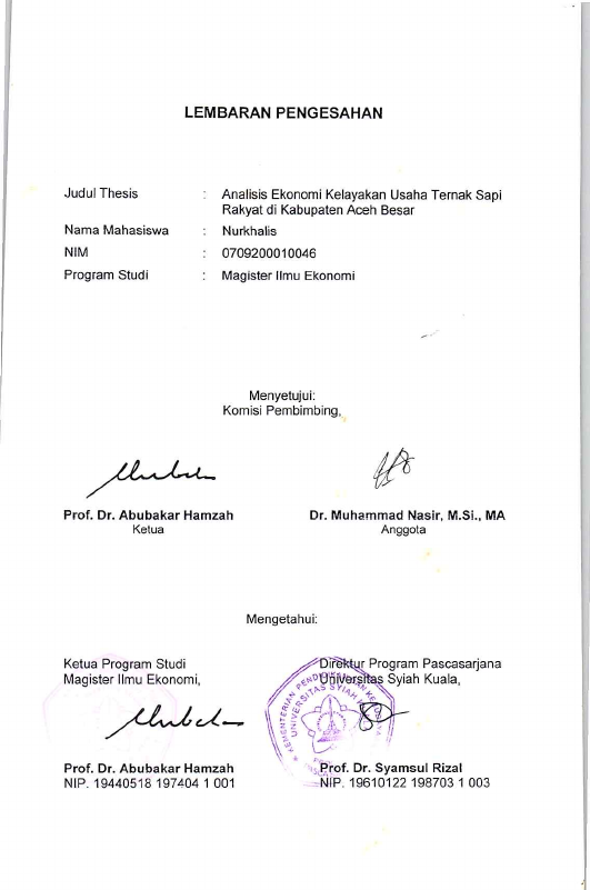 Nurkhalis, ANALISIS EKONOMI KELAYAKAN USAHA TERNAK SAPI RAKYAT DI KABUPATEN ACEH BESAR. Banda Aceh Prog. Studi Magister Ilmu Ekonomi,