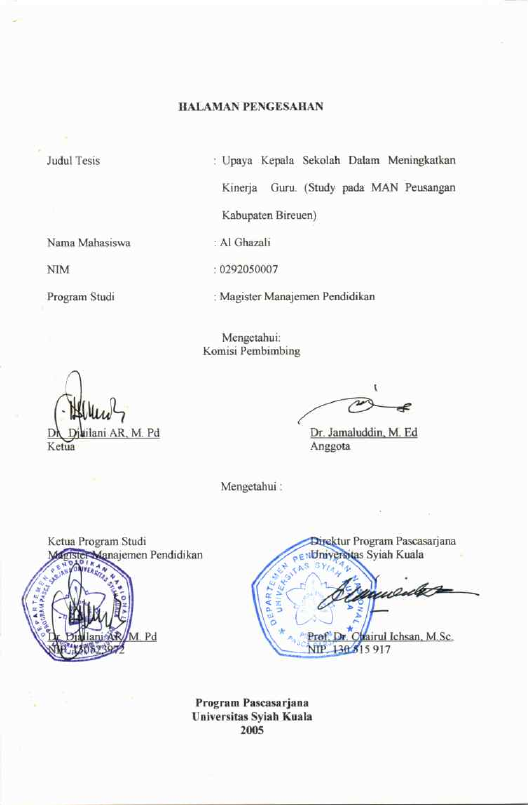 AL GHAZALI, UPAYA KEPALA SEKOLAH DALAM MENINGKATKAN KINERJA GURU (STUDI PADA MAN PEUSANGAN KABUPATEN BIREUEN). Banda Aceh prog.studi magister manajemen pendidikan,2005