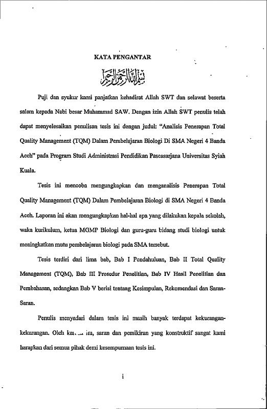 Husna husen, ANALISIS PENERAPAN TOTAL QUALITY MANAGEMENT (TQM) DALAM PEMBELAJARAN BIOLOGI DI SMAN 4 BANDA ACEH. Banda Aceh Prog. Studi Magister Manajemen,2009