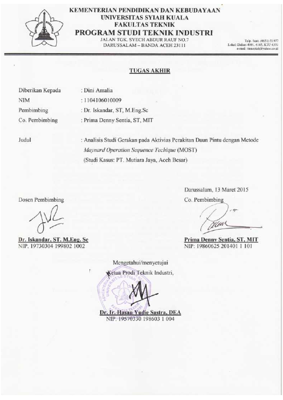 Dini Amalia, ANALISIS STUDI GERAKAN PADA AKTIVITAS PERAKITAN DAUN PINTU DENGAN METODE MAYNARD OPERATION SEQUENCE TECHNIQUE (MOST)RN(STUDI KASUS: PT. MUTIARA JAYA, ACEH BESAR). Banda Aceh Universitas Syiah Kuala,2015