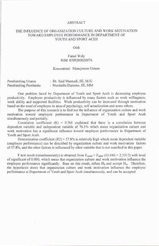 Baca Juga : PENGARUH BUDAYA ORGANISASI DAN MOTIVASI KERJA TERHADAP KINERJA PEGAWAI DINAS PEMUDA DAN OLAH RAGA ACEH (Faisal Waly, 2025)