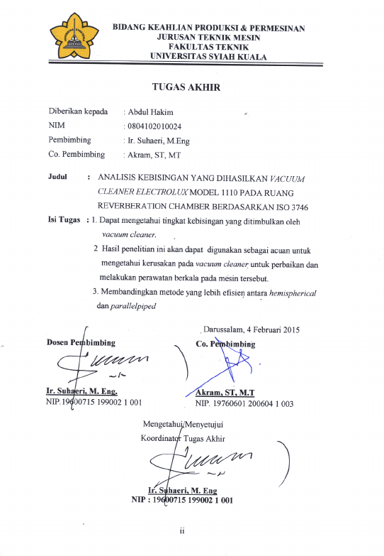 ABDUL HAKIM, ANALISIS KEBISINGAN YANG DIHASILKAN RNVACUUM CLEANER ELECTROLUX MODEL 1110 RNPADA RUANG REVERBERATION CHAMBER RNBERDASARKAN ISO 3746. Banda Aceh Universitas Syiah Kuala,2015