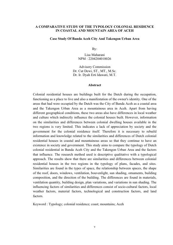 Lisa Maharani, PERBANDINGAN TIPOLOGI RUMAH TINGGAL KOLONIAL DI DAERAH PESISIR DAN PEGUNUNGAN ACEH STUDI KASUS : KOTA BANDA ACEH DAN KAWASAN PERKOTAAN TAKENGON. Banda Aceh Fakultas Teknik (S2),2025