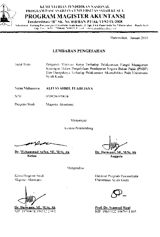Alfi Syahril Fuadi Jaya, PENGARUH MOTIVASI KERJA TERHADAP PELAKSANAAN FUNGSI MANAJEMEN KEUANGAN DALAM PENGELOLAAN PENDAPATAN NEGARA BUKAN PAJAK (PNBP) DAN DAMPAKNYA TERHADAP PELAKSANAAN AKUNTABILITAS KEUANGAN PADA UNIVERSITAS SYIAH KUALA. Banda Aceh Program Studi Magister Sains Akuntansi,2011