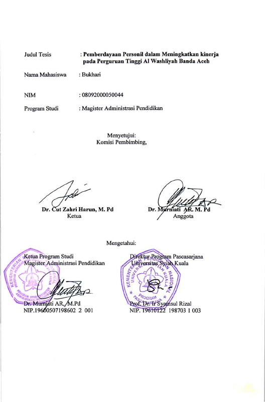 Bukhari, PEMBERDAYAAN PERSONIL DALAM MENINGKATKAN KINERJA PADA PERGURUAN TINGGI AL WASHLIYAH BANDA ACEH. Banda Aceh prog. studi magister pendidikan,2010