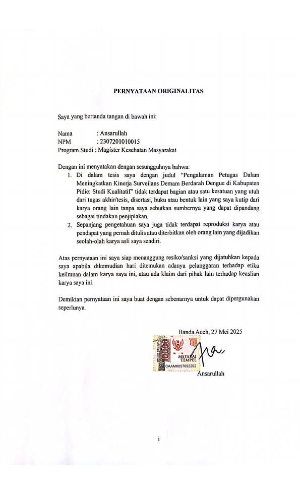Ansarullah, PENGALAMAN PETUGAS DALAM MENINGKATKAN KINERJA SURVEILANS DEMAM RNBERDARAH DENGUE DI KABUPATEN PIDIE: STUDI KUALITATIF. Banda Aceh FAKULTAS KEDOKTERAN UNIVERSITAS SYIAH KUALA,2025