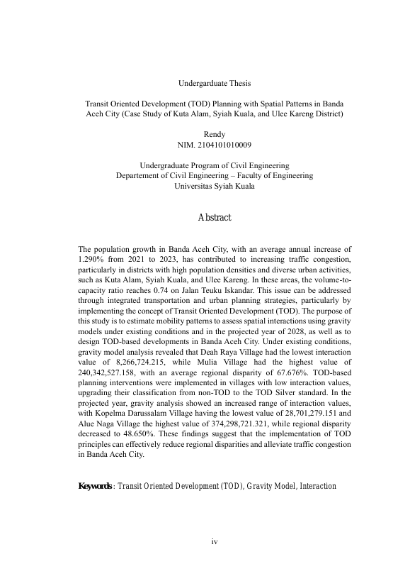 RENDY, PERENCANAAN TRANSIT ORIENTED DEVELOPMENT (TOD) DENGAN POLA RUANG DI KOTA BANDA ACEH (STUDI KASUS KECAMATAN KUTA ALAM, KECAMATAN SYIAH KUALA, DAN KECAMATAN ULEE KARENG). Banda Aceh Fak. Teknik Sipil,2025